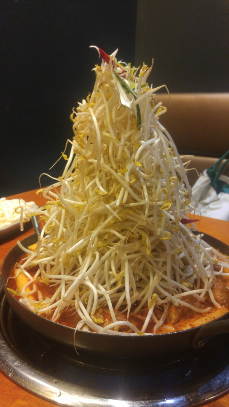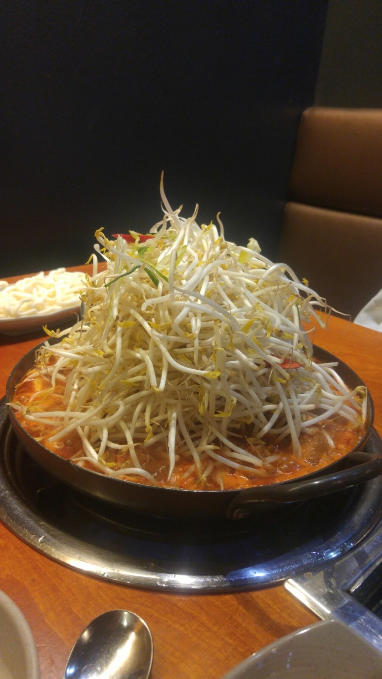 어느 정도 끓이다가 직원분이 한번 국자로 꾹 눌러주셔요. 그래서 솟아있던 숙주가 내려간 거랍니다.