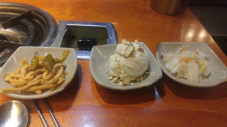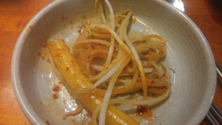 반찬으로 새콤한 무말랭이와 감자 샐러드, 백김치가 나와요.