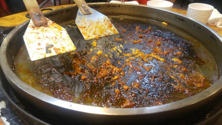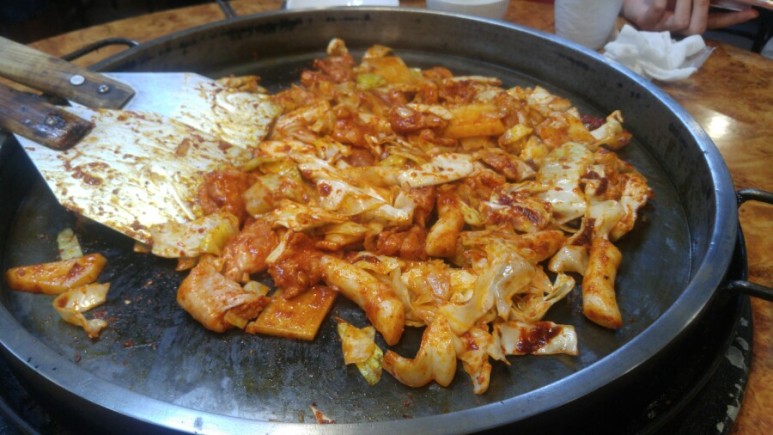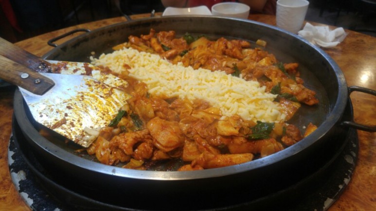 어느 정도 볶아지면 치즈를 가운데로 길을 내주신답니다.ㅎ 닭갈비를 치즈에 찍어먹으라고 설명해주셨습니다. 먹어보니 치즈와 닭갈비가 정말 잘 어울리더라고요. 매우 맛 있었습니다.