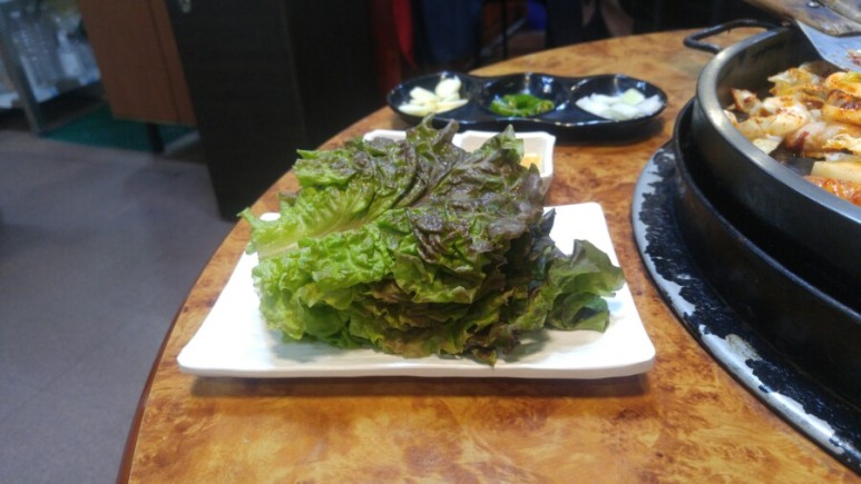 상추와 마늘, 양파, 고추 그리고 소스가 두 가지 입니다. 사장님께서 빨간 소스를 추천하시더라고요.