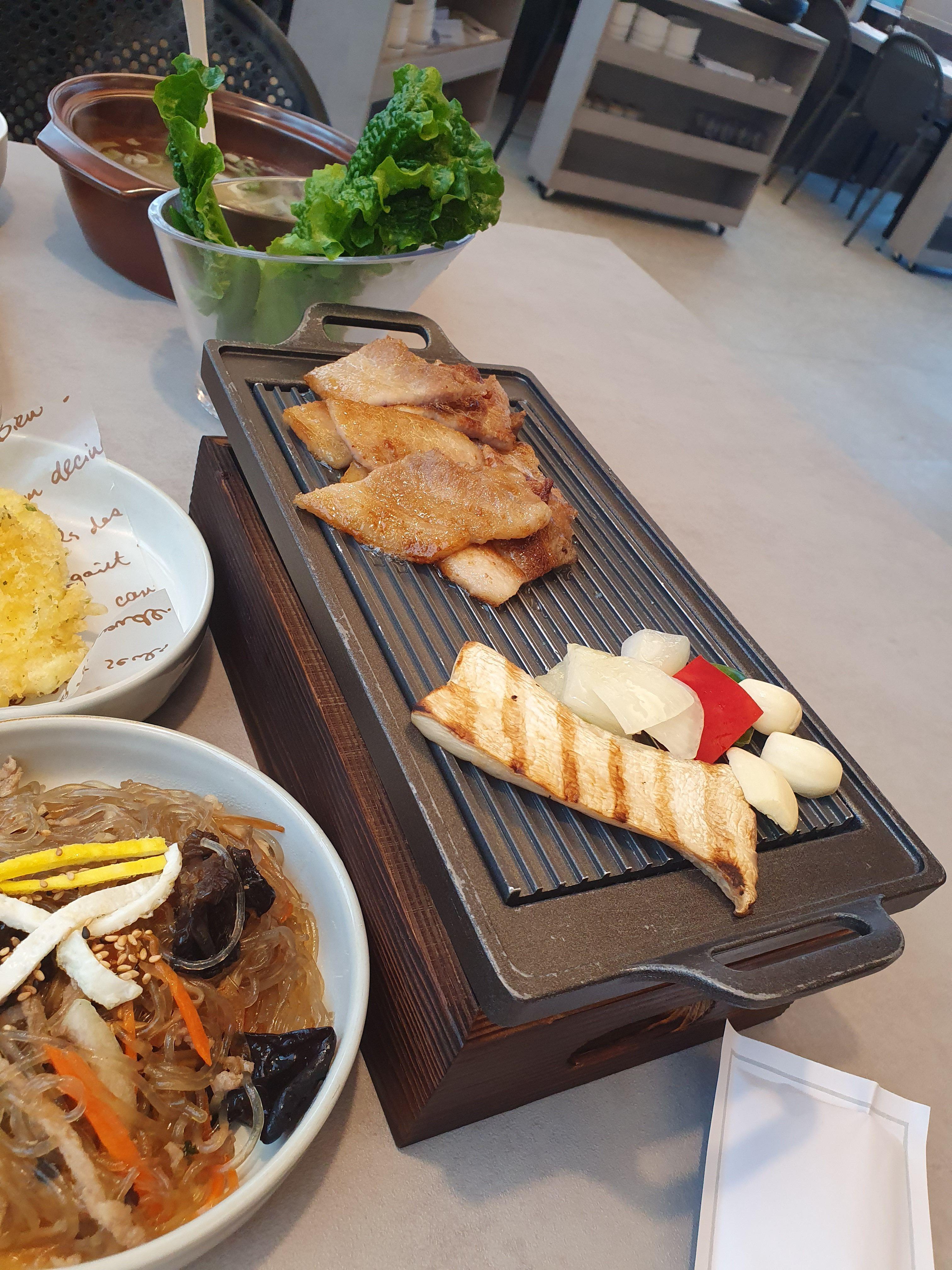 돼지고기가 구워져서 나오는데,따뜻하게 유지시켜주는 판에 올려져 있습니다.