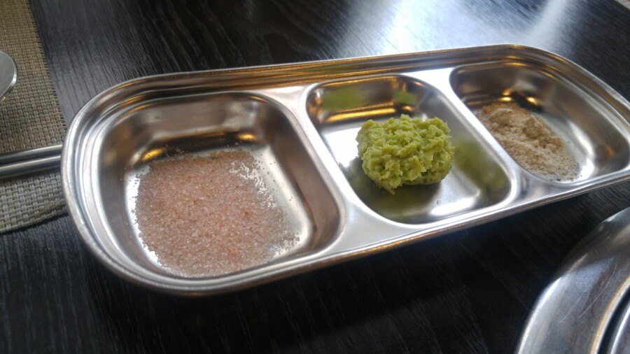 고기와 함께 먹을 소스, 양념류인데, 다른 집보다 다양한 것이 특징입니다. 와사비, 쌈장, 핑크 솔트, 쌈장, 갈치 속젓, 명태회, 명이나물 등이 나와요. 개인적으로 고기와 조합해서 가장 많은 양념을 제공한 고기집이었어요.