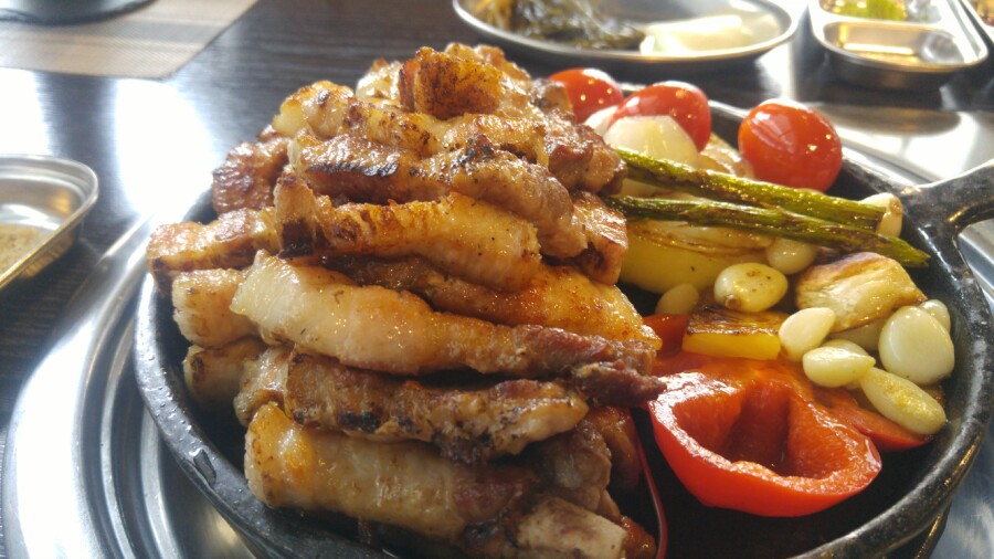 채소와 함께 구워주신 모습입니다. 그냥 맨 판에 주시는게 아니라 따뜻하게 먹을 수 있게 불판 위에 나옵니다.