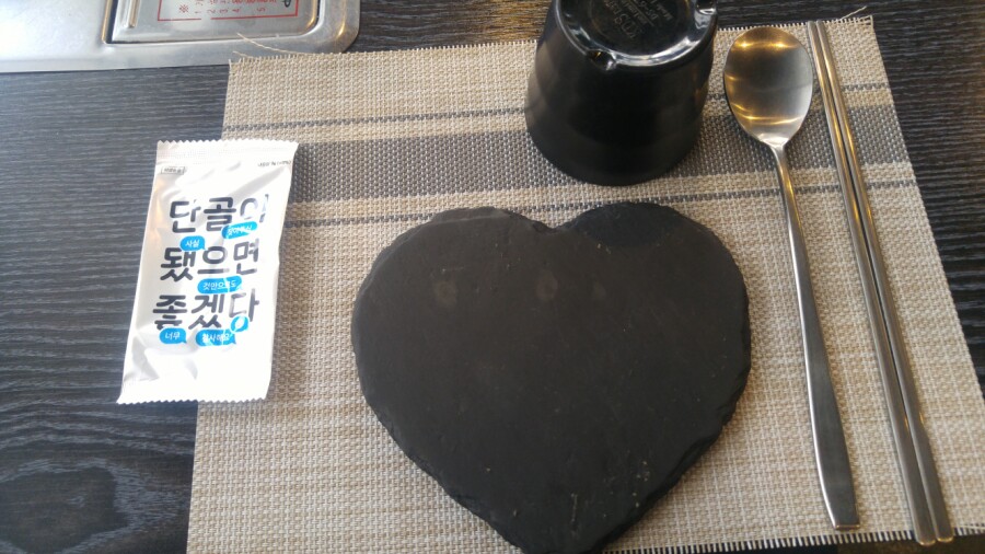 하트 모양의 접시가 세팅되어 있네요. 특이합니다. 그리고 이 집은 물수건도 특이하네요 ㅎㅎ